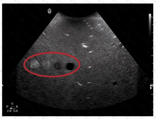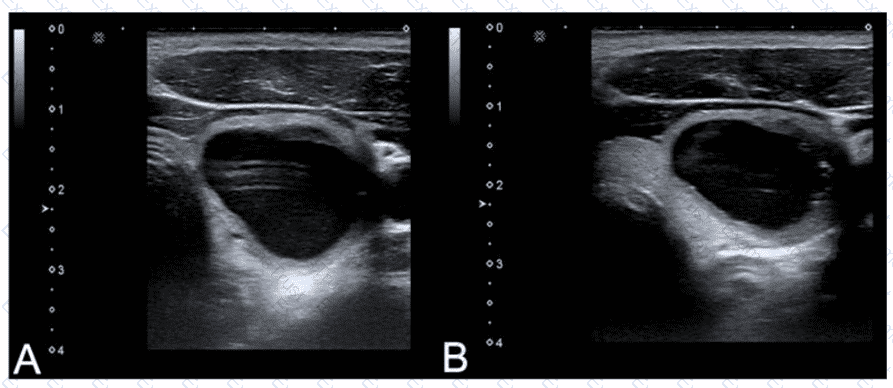 Which adjustment will reduce the artifact in the cystic lesion in image A resulting in image B?