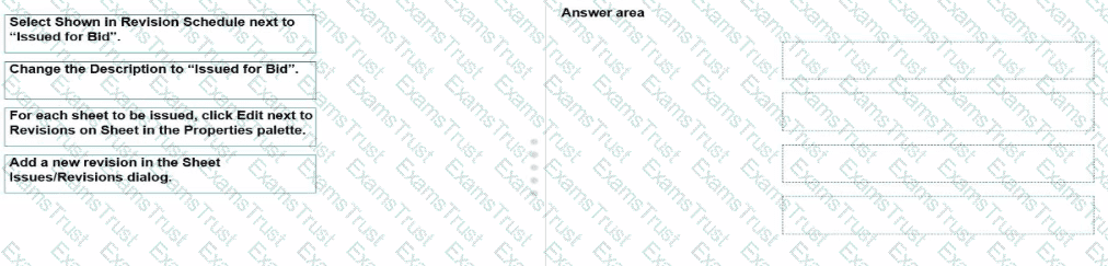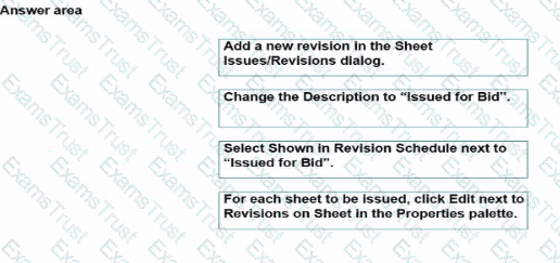 An electrical designer is issuing several sheets and wants 'Issued for Bid" to appear in the revision schedule of the title block. Drag and drop into the correct order to indicate how this can be accomplished to only the sheets that are being issued.