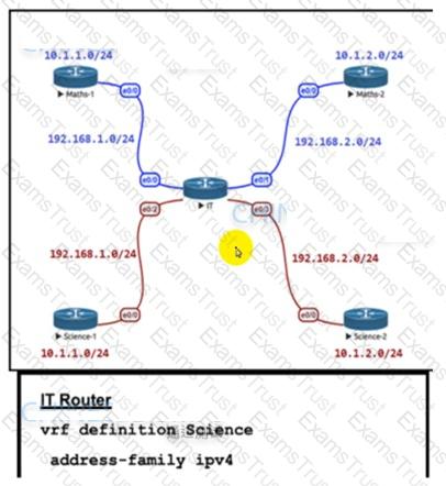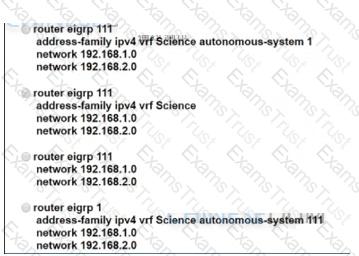Refer to the exhibit. The IT router has been configured with the Science VRF and the interfaces have been assigned to the VRF. Which set of configurations advertises Science-1 and Science-2 routes using EIGRPAS 111?