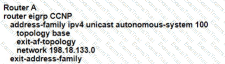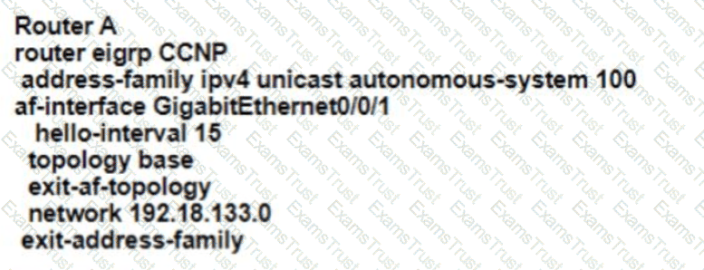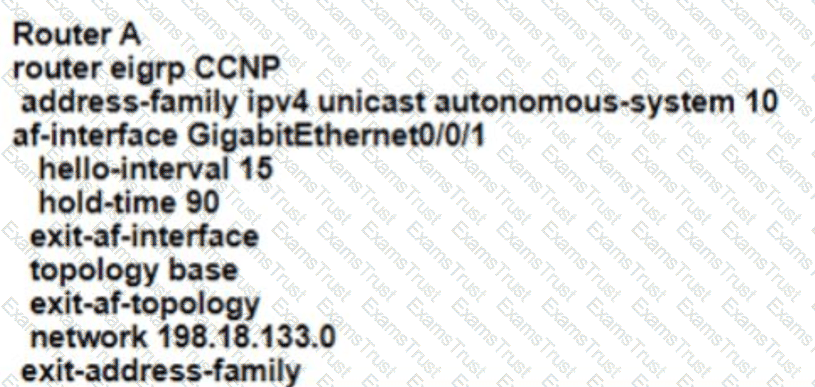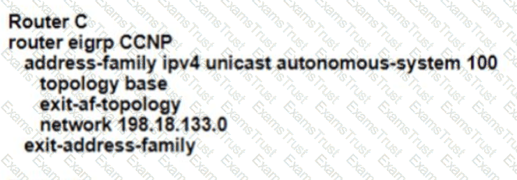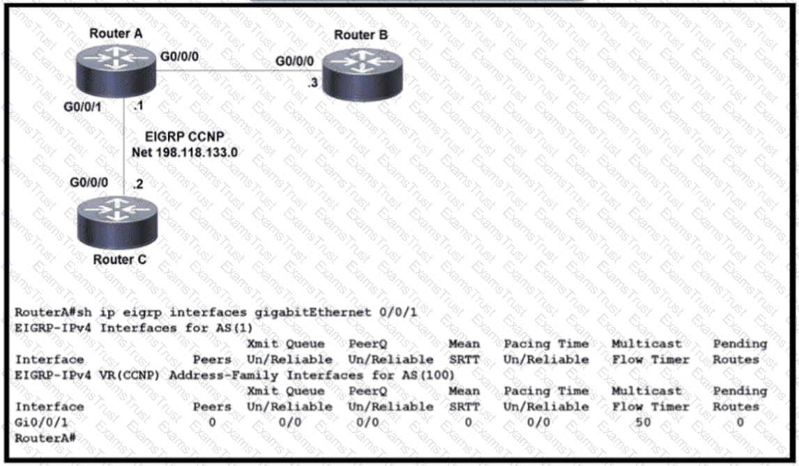 Refer to the exhibit EIGRP adjacency between router A and router C is not working as expected Which two configurations resolve the issue? (Choose two )