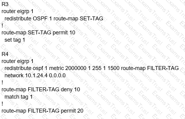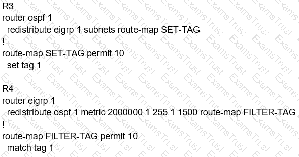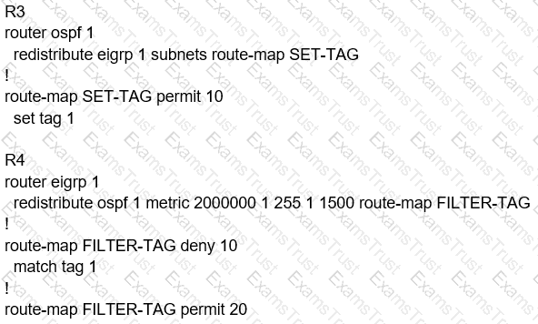 Refer to the exhibit. A network administrator configured mutual redistribution on R1 and R2 routers, which caused instability in the network. Which action resolves the issue?