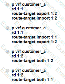 The network administrator configured VRF lite for customer A. The technician at the remote site misconfigured VRF on the router. Which configuration will resolve connectivity for both sites of customer_a?