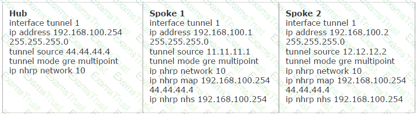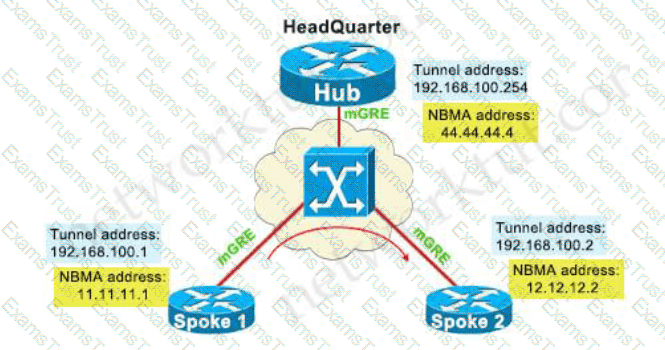 A network administrator has successfully configured DMVPN topology between a hub and two spoke routers. Which two configuration commands should establish direct communications between spoke 1 and spoke 2 without going through the hub? (Choose two).