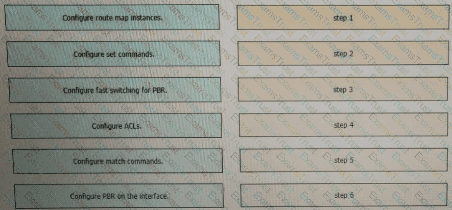 Drag and drop the actions from the left into the correct order on the right to configure a policy to avoid following packet forwarding based on the normal routing path.