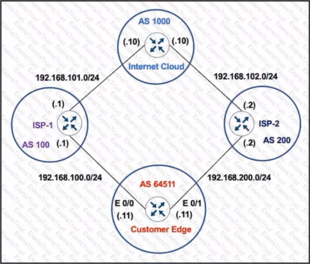 Refer to the exhibit. The network administrator has configured the Customer Edge router (AS 64511) to send only summarized routes toward ISP-1 (AS 100) and ISP-2 (AS 200).