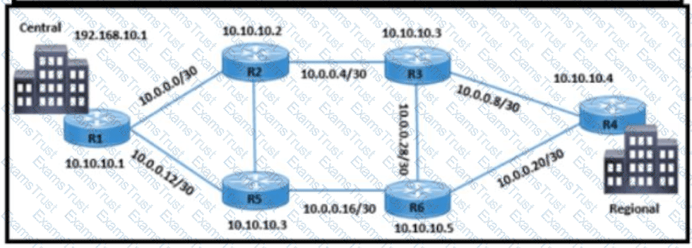 Refer to me exhibit Traffic from R3 to the central site does not use alternate paths when R3 cannot reach 10 10 10 2 Traffic on R3 destined to R4 takes an alternate route via 10 10 10.6 when 10 10 10 4 is not accessible from R3 Which configuration switches traffic destined to 10 10 10 2 from R3 on the alternate path’’