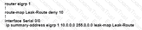 An engineer configured a leak-map command to summarize EIGRP routes and advertise specifically loopback 0 with an IP of 10.1.1.1.255.255.255.252 along with the summary route. After finishing configuration, the customer complained not receiving summary route with specific loopback address. Which two configurations will fix it? (Choose two.)