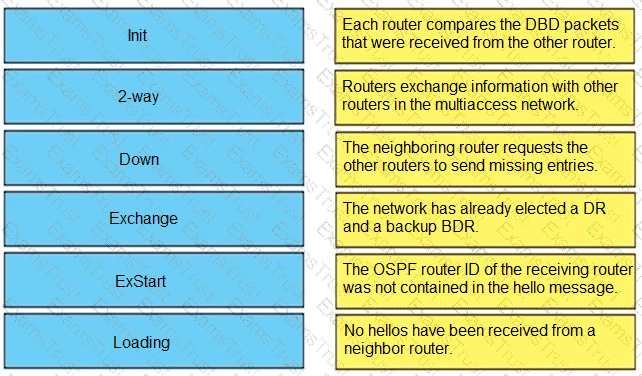 Drag and drop the OSPF adjacency states from the left onto the correct descriptions on the right.