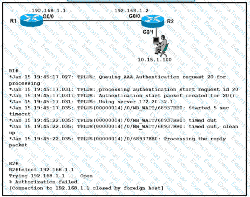 Refer to the exhibit A network engineer is troubleshooting an AAA authentication issue for R1 from R2 When an engineer tries to open a telnet connection to R1 it opens the connection but shows a %Authorization failed error message on the terminal and closes the connection silently Which action resolves the issue?