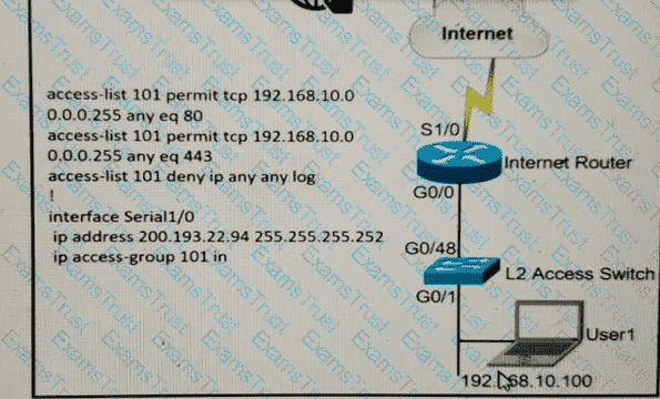 A network administrator is tasked to permit http and https traffic only toward the internet from the User1 laptop to adhere to company’s security policy. The administrator can still ping to Which interface should the access list 101 be applied to resolve this issue?