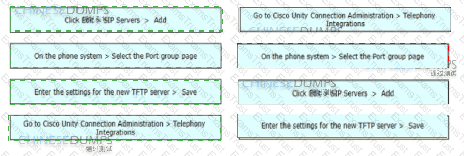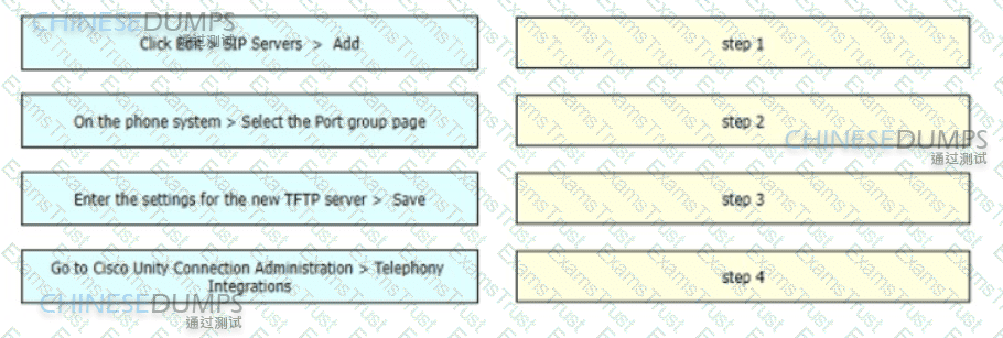 An engineer is working on a SIP integration between Cisco UCM and Cisco Unity Connection and must add an additional TFTP server Drag and drop the configuration steps from the left into the correct order on the right.