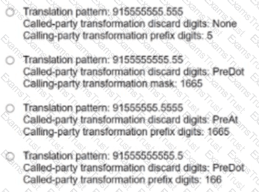An engineer must configure a new Cisco UCM translation pattern to convert 915555555555 into 1665 Which translation pattern must be used?