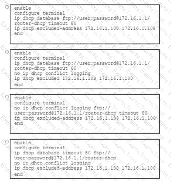 An engineer must configure a DHCP server to save automatic bindings on a remote host that has an IP address of 172.16.1.1. The IP address range of 172.16.1.100 to 172.16.1.108 must be blocked from the DHCP server. Which set of commands must the engineer run?