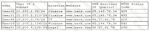 A company's help desk is experiencing a large number of calls from the finance department slating access issues to www bank com The security operations center reviewed the following security logs: