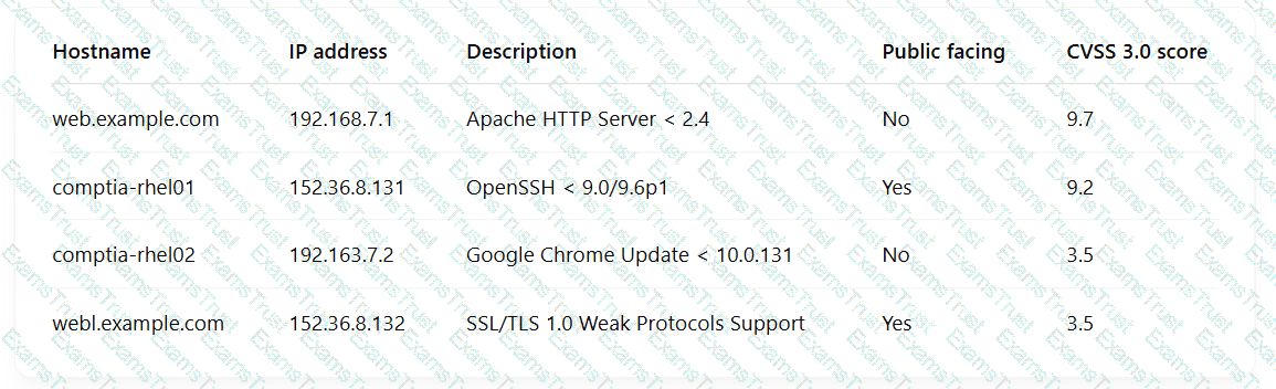 A Chief Information Security Officer requests an action plan to remediate vulnerabilities. A security analyst reviews the output from a recent vulnerability scan and notices hundreds of unique vulnerabilities. The output includes the CVSS score, IP address, hostname, and the list of vulnerabilities. The analyst determines more information is needed in order to decide which vulnerabilities should be fixed immediately. Which of the following is the best source for this information?