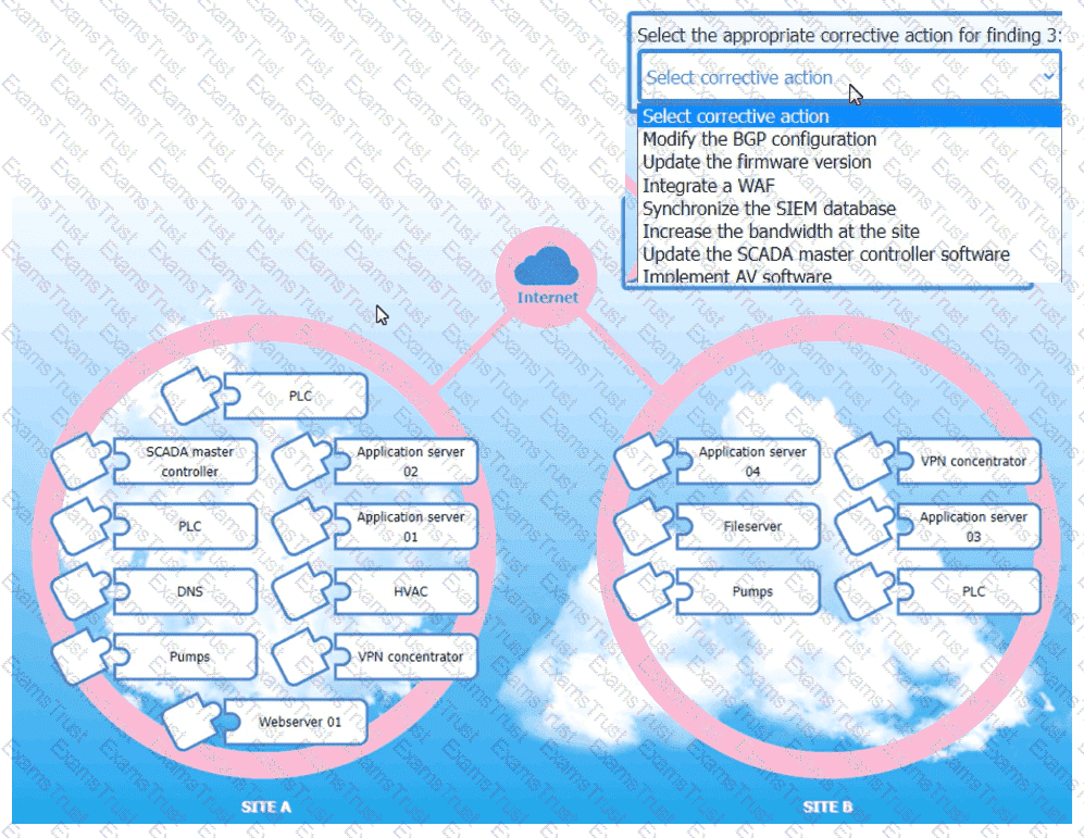 For findings 1 and 2, select the items that should be replicated to Site B. For finding 3, select the item requiring configuration changes, then select the appropriate corrective action from the drop-down menu.