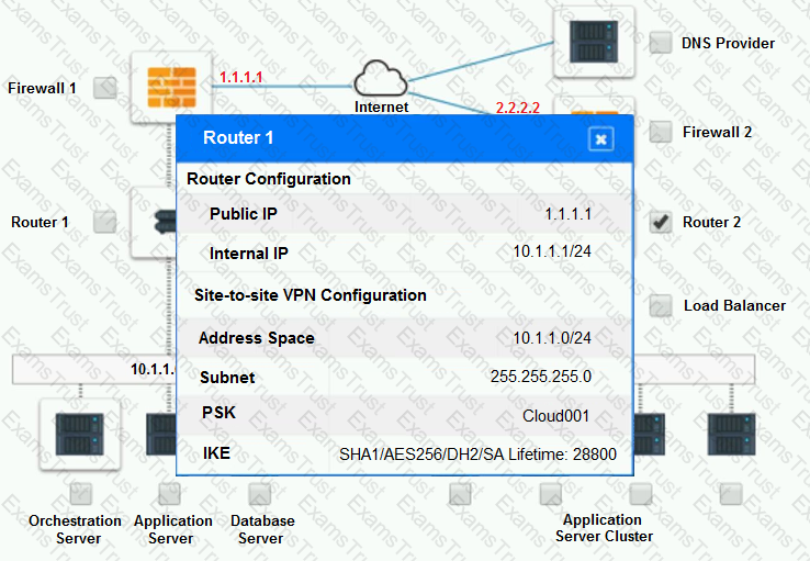 Analyze the configuration of the following components: DNS, Firewall 1, Firewall 2, Router 1, Router 2, VPN and Orchestrator Server.