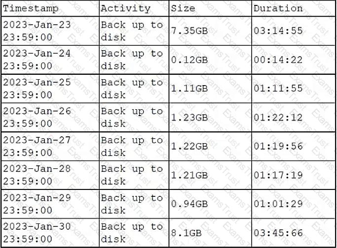 A DBA is reviewing the following logs to determine the current data backup plan for a primary data server: