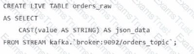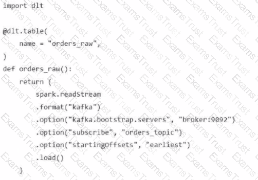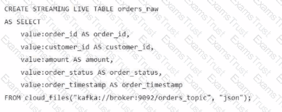 A data engineer streams customer orders into a Kafka topic (orders_topic) and is currently writing the ingestion script of a DLT pipeline. The data engineer needs to ingest the data from Kafka brokers to DLT using Databricks