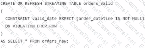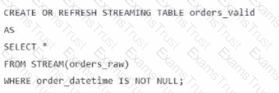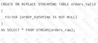 A data engineer is processing ingested streaming tables and needs to filter out NULL values in the order_datetime column from the raw streaming table orders_raw and store the results in a new table orders_valid using DLT.
