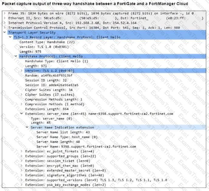 Refer to the exhibit, which shows the packet capture output of a three-way handshake between FortiGate and FortiManager Cloud.