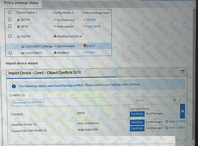 A policy package conflict status and information from the import device wizard in the Core1 VDOM are shown. When you import a policy package, the following message appears for the Web_restrictions web filter profile and the deep-inspection SSL-SSH profile: "The following objects were found having conflicts. Please confirm your settings, then continue." The Web_restrictions and deep-inspection profiles are used by other FortiGate devices within FortiManager. Which step must you take to resolve the issue? (Choose one answer)