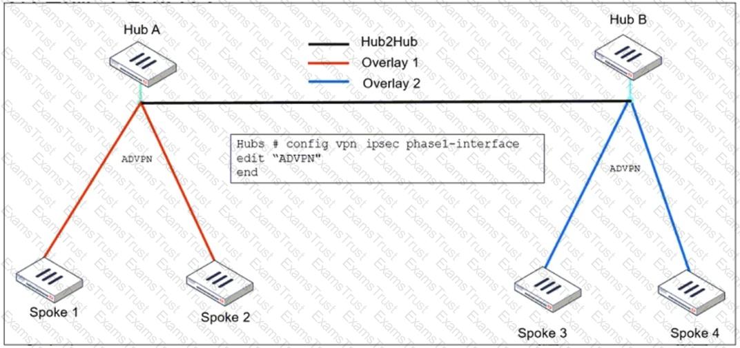 Refer to the exhibit, which shows the ADVPN IPsec interface representing the VPN IPsec phase 1 from Hub A to Spoke 1 and Spoke 2, and from Hub В to Spoke 3 and Spoke 4.