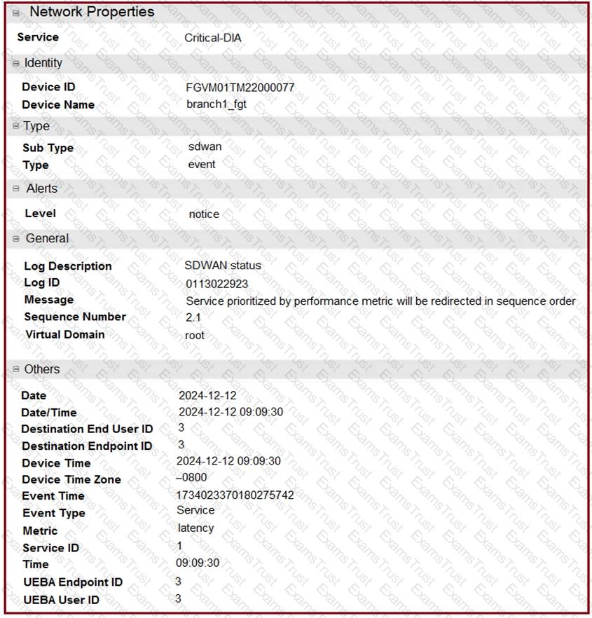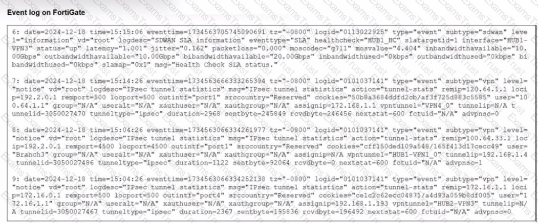 The exhibits show an SD-WAN event log, the member status, and the SD-WAN rule configuration.