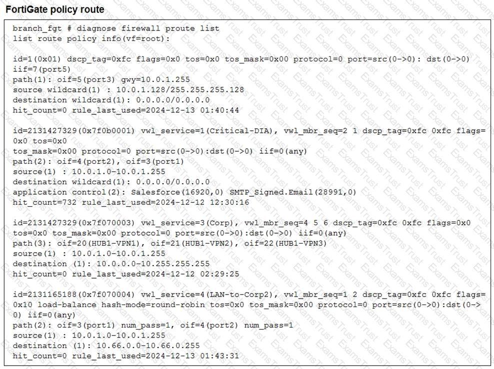 You collected the output shown in the exhibits and want to know which interface HTTP traffic will flow through from the user device 10.0.1.101 to the corporate web server 10.0.0.126. All SD-WAN links are stable.