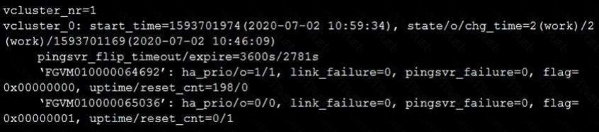 The exhibit displays the output of the CLI command: diagnose sys ha dump-by vcluster.