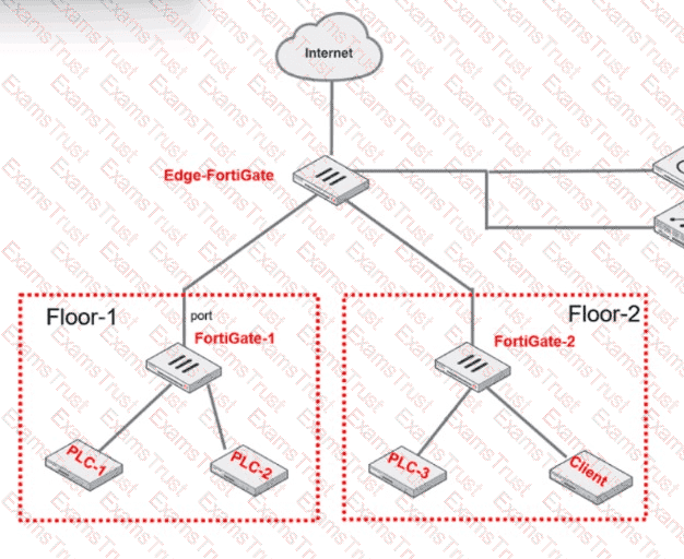 PLC-3 and CLIENT can send traffic to PLC-1 and PLC-2. FGT-2 has only one software switch (SSW-1) connecting both PLC-3 and CLIENT. PLC-3 and CLIENT can send traffic to each other at the Layer 2 level.