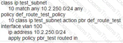 You are configuring Policy Based Routing (PBR) for a subnet that will be used to test a new default route for your network Traffic originating from 10.2.250.0/24 should use a new default route to 10.1.1.253. Other non-default routes for this subnet should not be affected by this change.