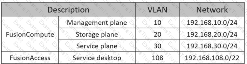 TheManagement planeis specifically designed to facilitate communication between management systems and all nodes within the cloud environment. In the provided scenario, the network segment192.168.10.0/24(VLAN 10) is designated as the FusionCompute Management plane. Huawei's official best practices dictate that Linux infrastructure VMs must be deployed on this plane to allow them to communicate directly with theVirtual Resource Management (VRM)node and theComputing Node Agent (CNA)hosts. This placement ensures that management traffic for desktop provisioning and resource orchestration remains isolated from general user traffic and heavy storage data flows.
