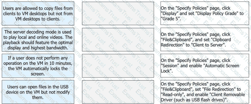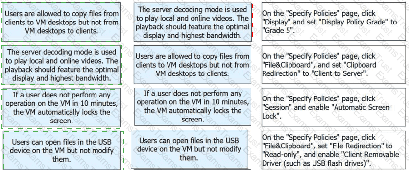 FusionAccess application policies allow users to use VM desktops. Match the following application scenarios with their operations