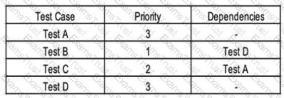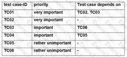 The following table shows six test cases TC01 to TC06 with their priorities and dependencies.