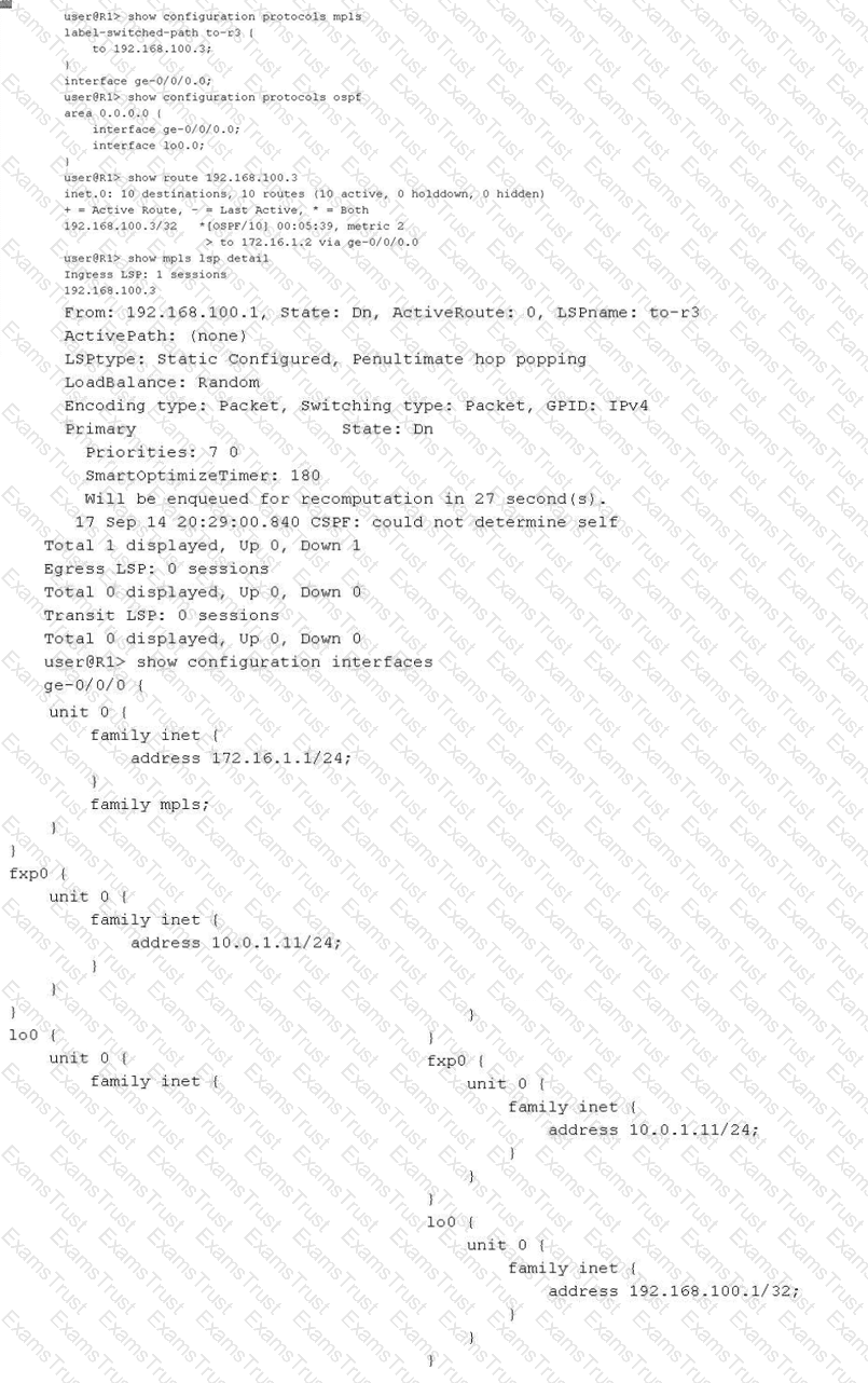 You have configured an MPLS LSP to 192.168.100.3. However, the LSP is in the down state. Referring to the exhibit, which two actions would solve this problem? (Choose two.)