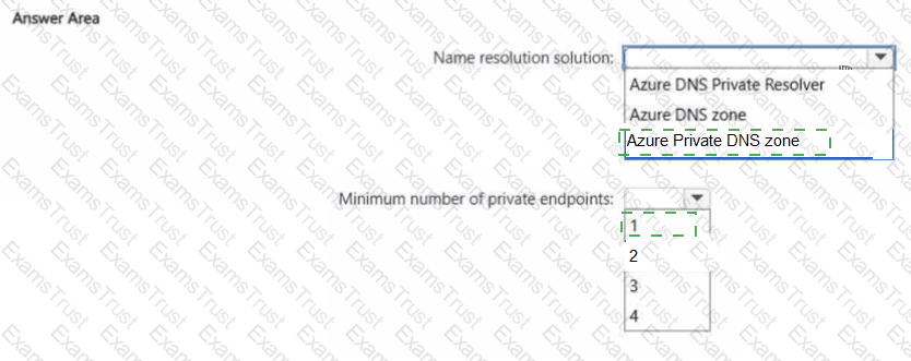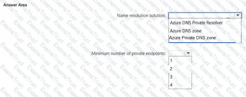 Which name resolution solution should you use, and what is the minimum number of private endpoints required? To answer, select the appropriate options in the answer area.