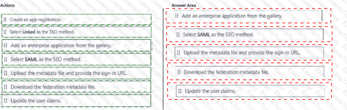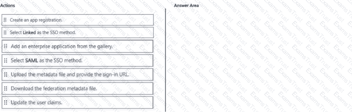 Which five actions should you perform in sequence in the Microsoft Entra admin center? To answer, move the appropriate actions from the list of actions to the answer area and arrange them in the correct order.
