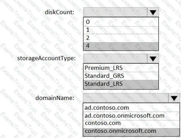 Which values should you provide for diskCount, StorageAccountType, and domainName? To answer, select the appropriate options in the answer area.
