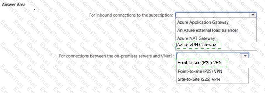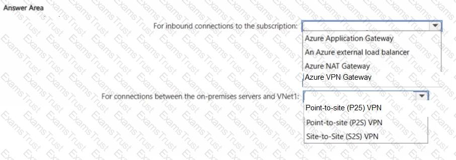 Which address spaces should you assign to VNet1 and GatewaySubnet? To answer, select the appropriate options in the answer area.