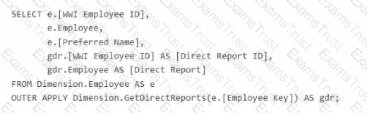 You have a Fabric tenant that contains a warehouse named WH1. You run the following T-SQL query against WH1.
