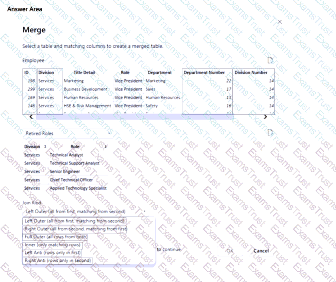 You need to merge the Employee query with the Retired Roles query. The solution must ensure that rows in the Employee query that match the Retired Roles query are removed.