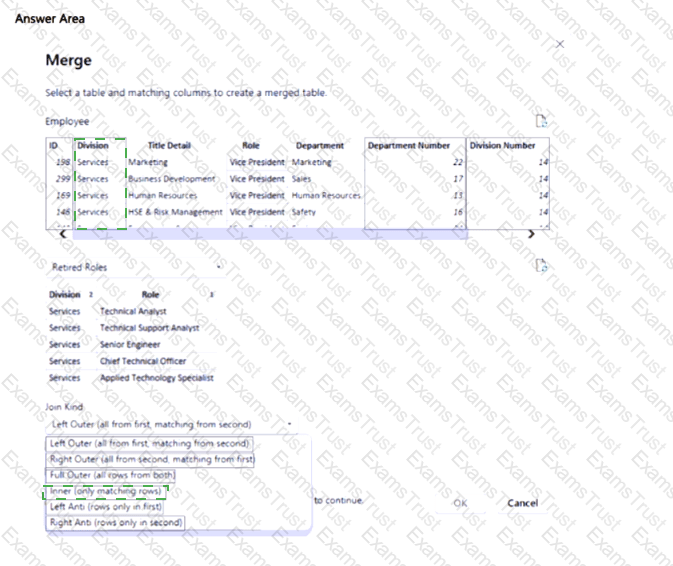 Which column and Join Kind should you use in Power Query Editor? To answer, select the appropriate options in the answer area.