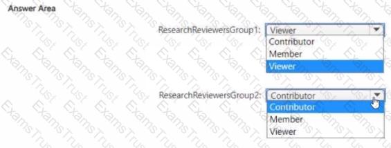 Which workspace rote assignments should you recommend for ResearchReviewersGroupl and ResearchReviewersGroupZ? To answer, select the appropriate options in the answer area.