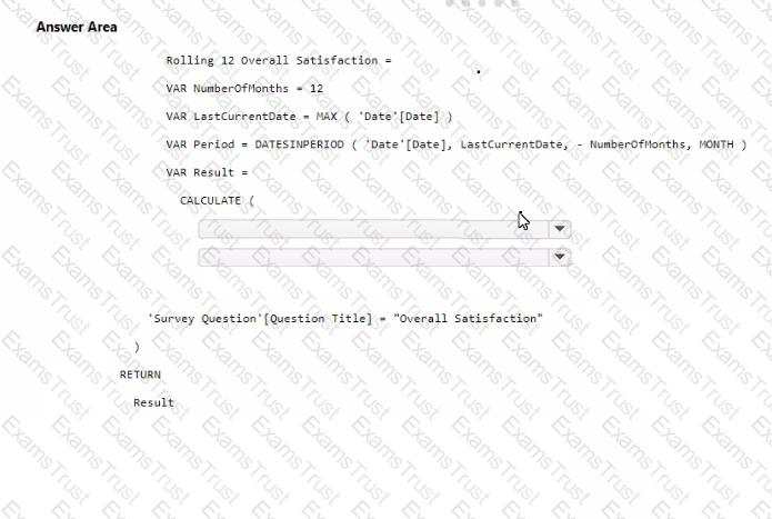 How should you complete the DAX code? To answer, select the appropriate options in the answer area.