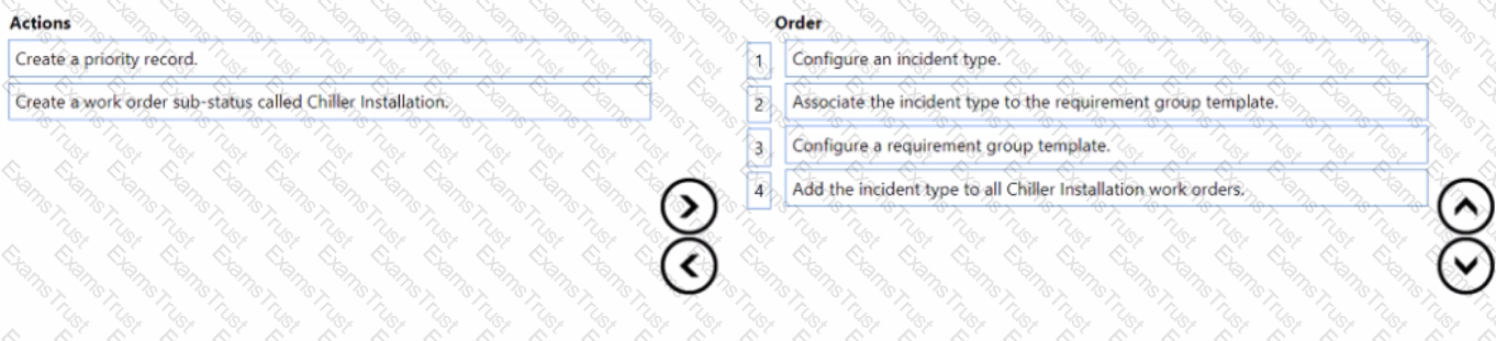 You need to configure the functionality necessary to automatically add all the tasks and resources needed to a work order when the work order type is Chiller Installation. You must follow the established Contoso guidelines for installation requirements, as outlined in the Case Study, and create the most efficient process possible.
