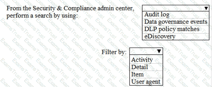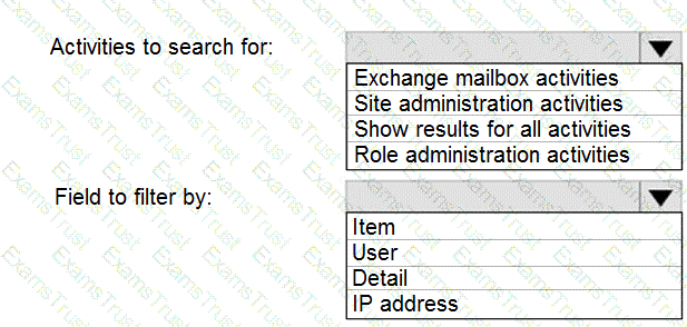 For which activities should you search and by which field should you filter in the audit log search? To answer, select the appropriate options in the answer area.