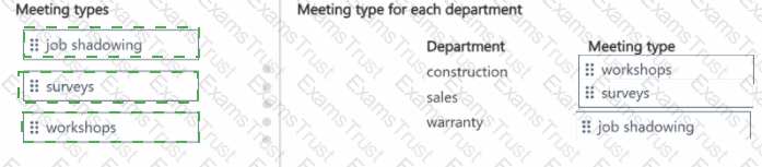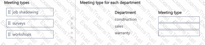 To answer, move the appropriate meeting types to the correct departments. You may use each meeting type once, more than once, or not at all. You may need to move the split bar between panes or scroll to view content.