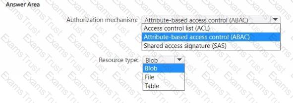 Which authorization mechanism should you enable, and which type of resource should you use to store the data? To answer, select the appropriate options in the answer area.
