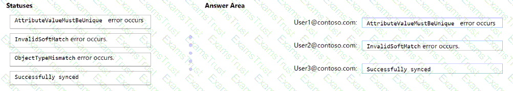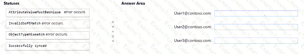 Which sync status will Microsoft Entra Connect sync return for each user? To answer, drag the appropriate status to the correct users. Each status may be used once, more than once, or not at all. You may need to drag the split bar between panes or scroll to view content.